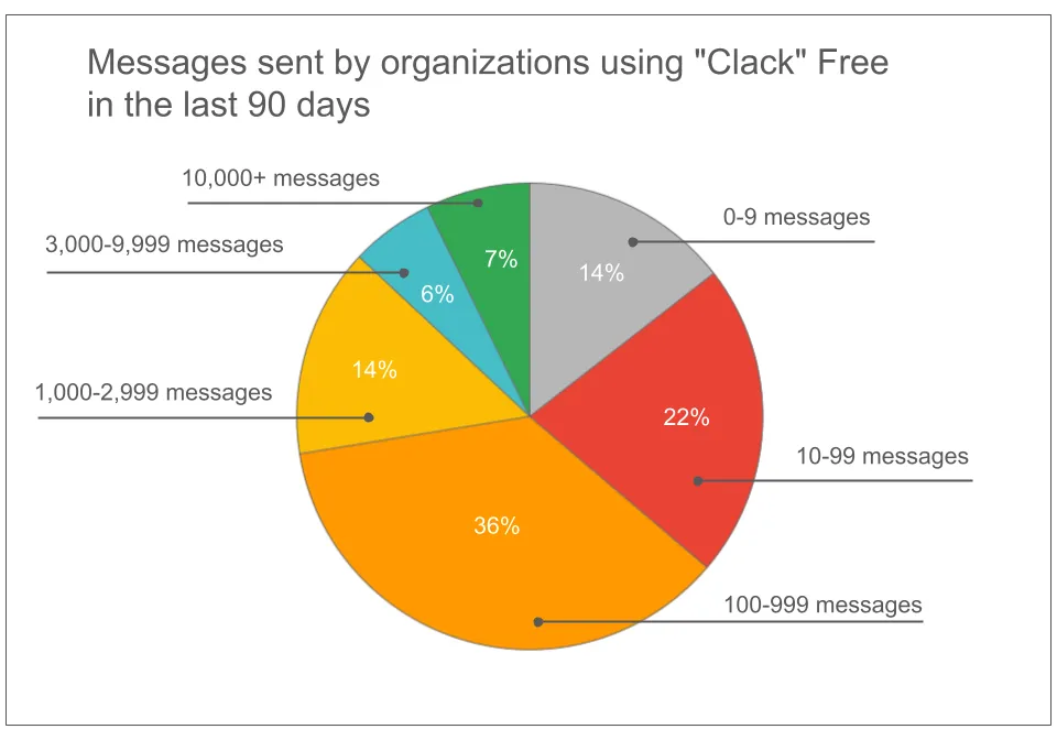 Just 7% of teams will benefit from Clack’s policy change, but perhaps inactive teams (the grey segment) should be excluded from the analysis, bringing the number all the way up to… 8%. Or perhaps only teams sending about one message a day or more should be considered active (excluding the red segment) — in that case, 11% of active organizations would benefit.