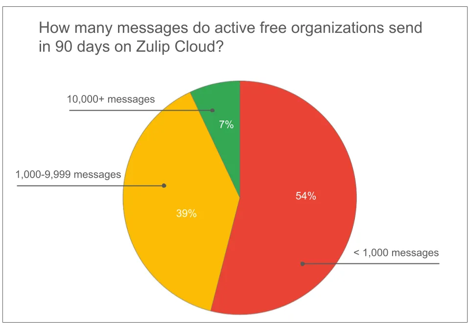 Slack’s press release paints a very different picture — one where the green segment is the majority of the pie chart. The exact level of activity for teams using Slack’s free plan likely differs somewhat from Zulip Cloud. But the most realistic way for that green segment to be the majority of Slack’s pie chart is if Slack defined “active free teams” to exclude most teams that are actually using their free plan.