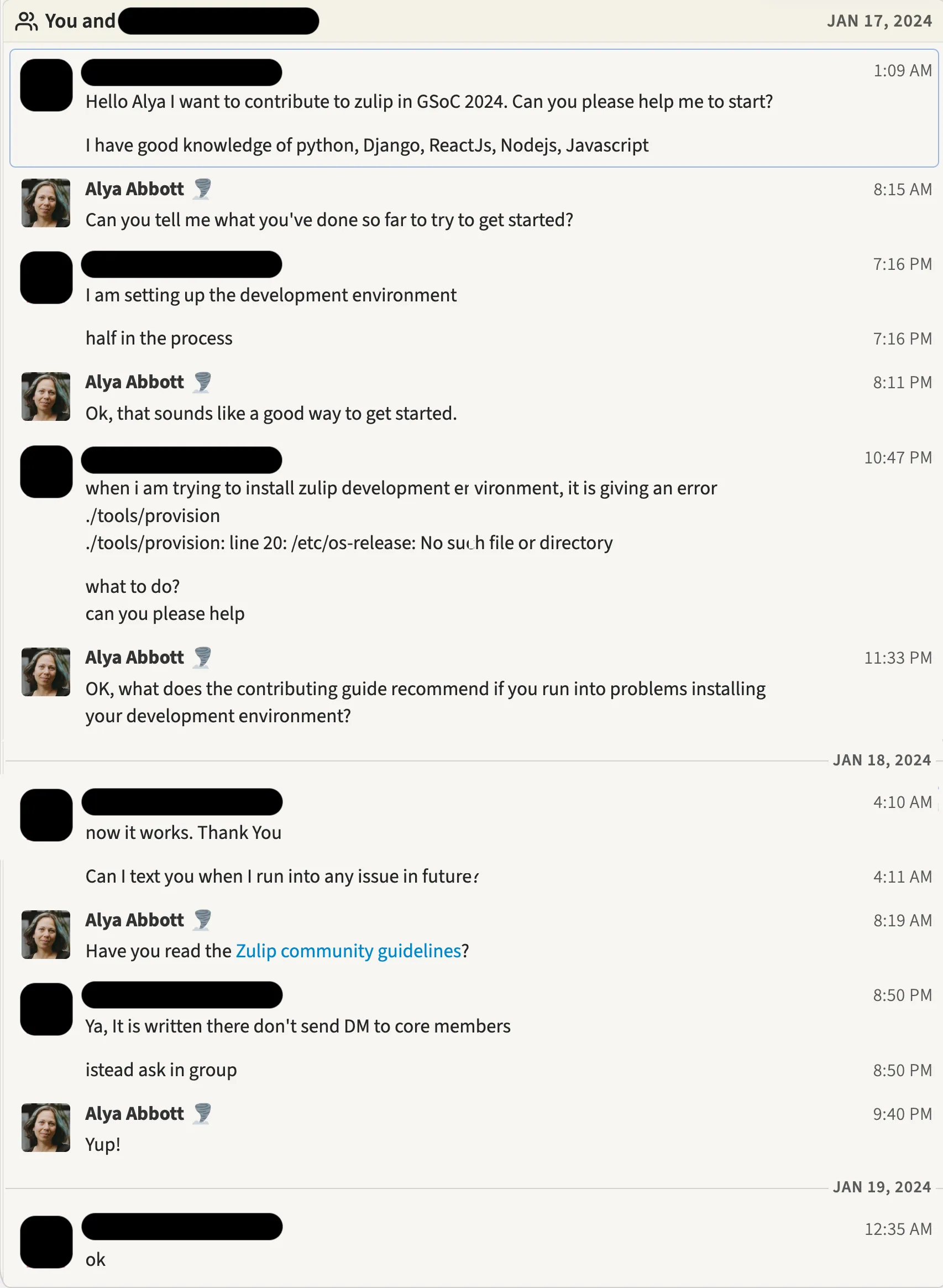 Finally, I realized that I could actually do something about the situation. I couldn’t compel all new contributors to read and follow Zulip’s guidelines, and not to waste my time. Ignoring these messages wouldn’t feel right to me either. But I could change how I responded to them.