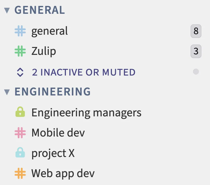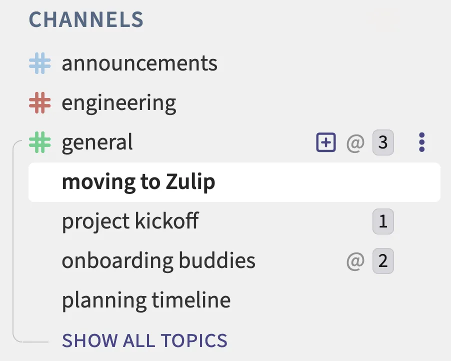You can now view a list of recent topics in any channel, to get an overview of ongoing conversations. You decide whether channel links in the left sidebar go to the list of topics, the channel feed, the top topic, or the top unread topic.