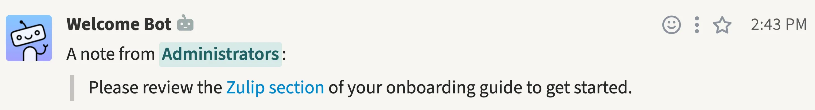 You can now configure a custom welcome message to be sent to new users. For example, you can describe the purpose of important channels, and link to your guidelines for using Zulip.