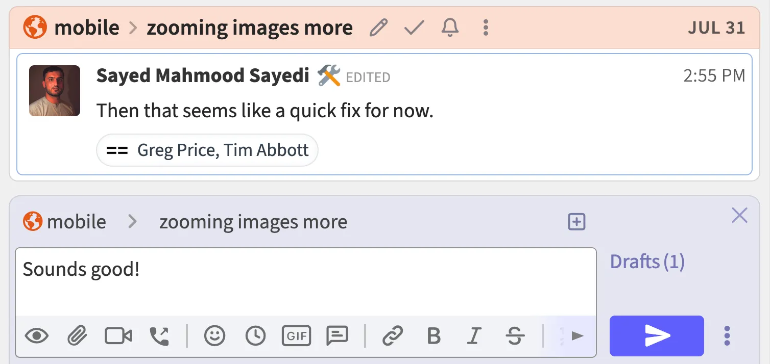 We believe that getting the little details right makes a big difference in a product that’s so central to people’s daily work. To make Zulip a joy to use, we relentlessly fine-tune the user experience, and consider it a priority to investigate and fix even minor bugs. This release contains hundreds of refinements beyond those described here.
